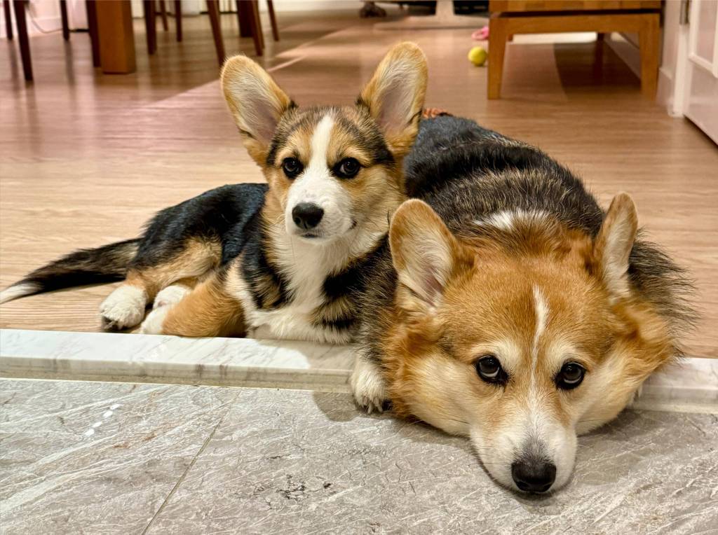 In the early months of 2024 we were contacted by Derek in Hong Kong looking for another pup to follow truffles who flew in 2017 and had been Derek’and his wife’s companion and he was looking to guard the future by bringing another pup. Derek originally contact us in 2015 wanting a tri colour bitch and he had to wait for two years for us to have a litter with tri’s in. Above you can see Truffles with Perla who flew out in December 2024.