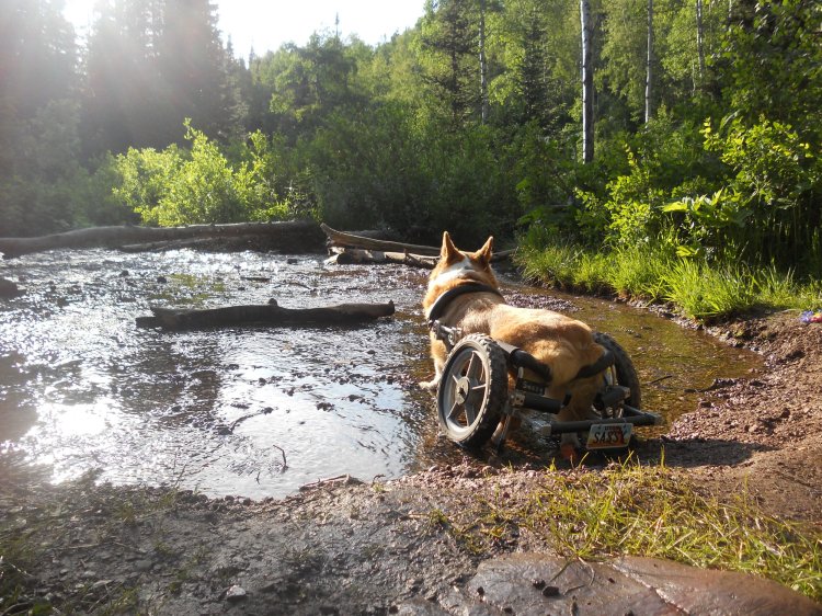 Degenerative Myleopathy is a cruel condition which in later life affects the rear of the spine. On the picture above, an unfortunate Pembroke can be seen trying to enjoy a dip whilst in a stream.