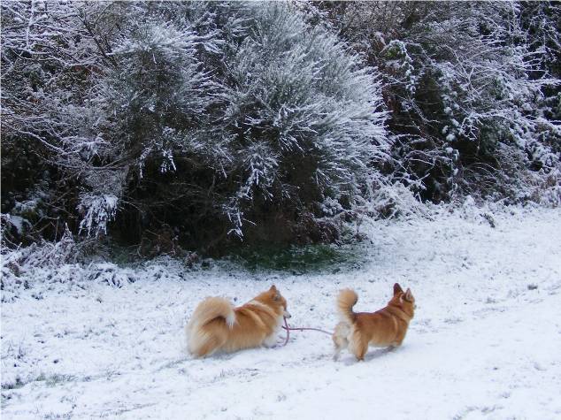 Gemini became the source of our knowledge through the four litters she had. We were extremely fortunate to be able to bring in Startori Andreas from Ireland and he was able to overturn some of the problems we had with the male side of her breeding. Gemini now lives with our family in Northamptonshire along with Michael and can be seen doing agility. Gemini can be seen here taking Angel for a walk one cold morning.